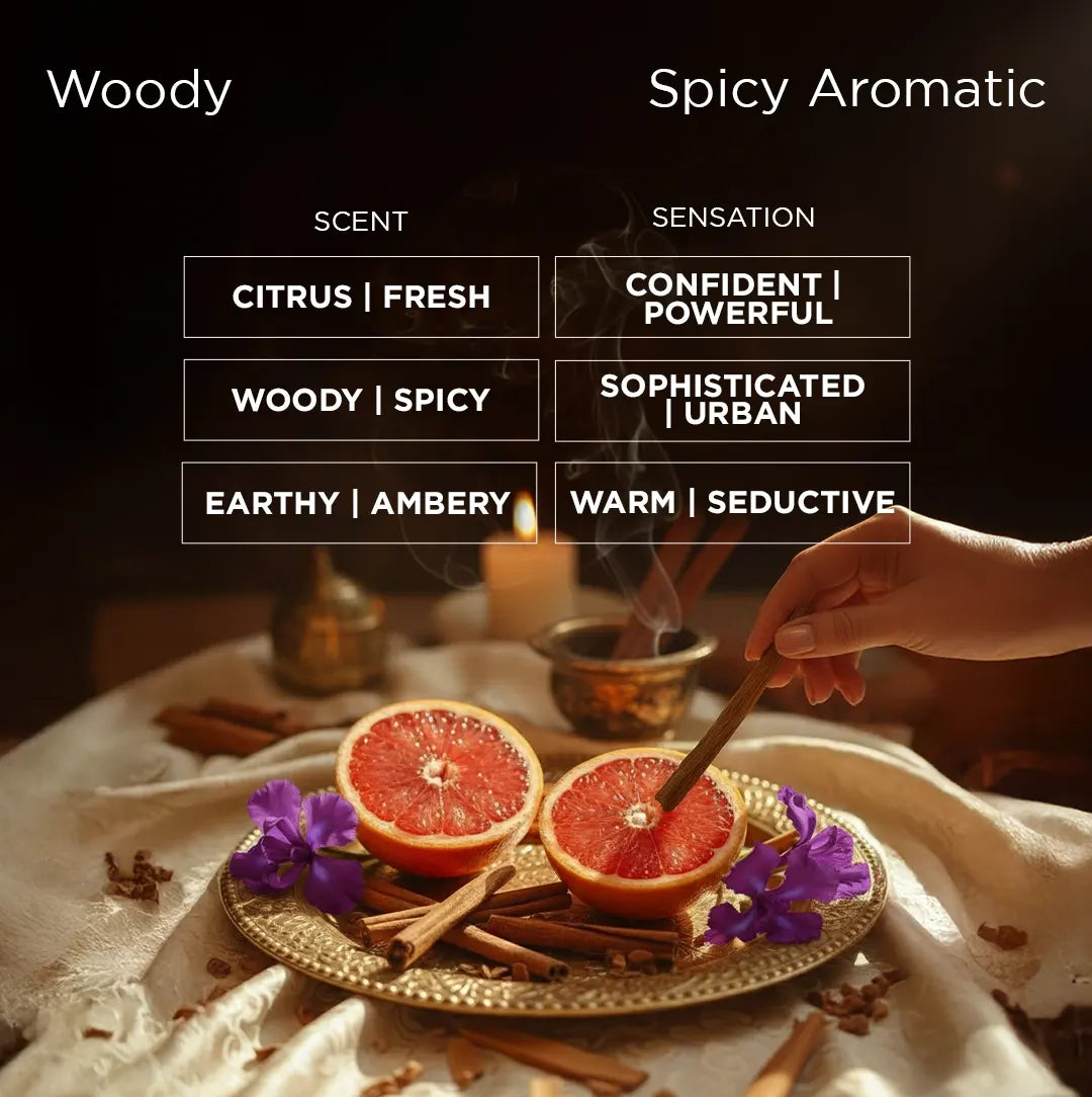 Sandal Veer opens with a bright and energizing hit ofgrapefruit, lifted by the warm spice ofcardamomand the sharp kick ofpepper. The top is fresh yet masculine, instantly drawing attention.